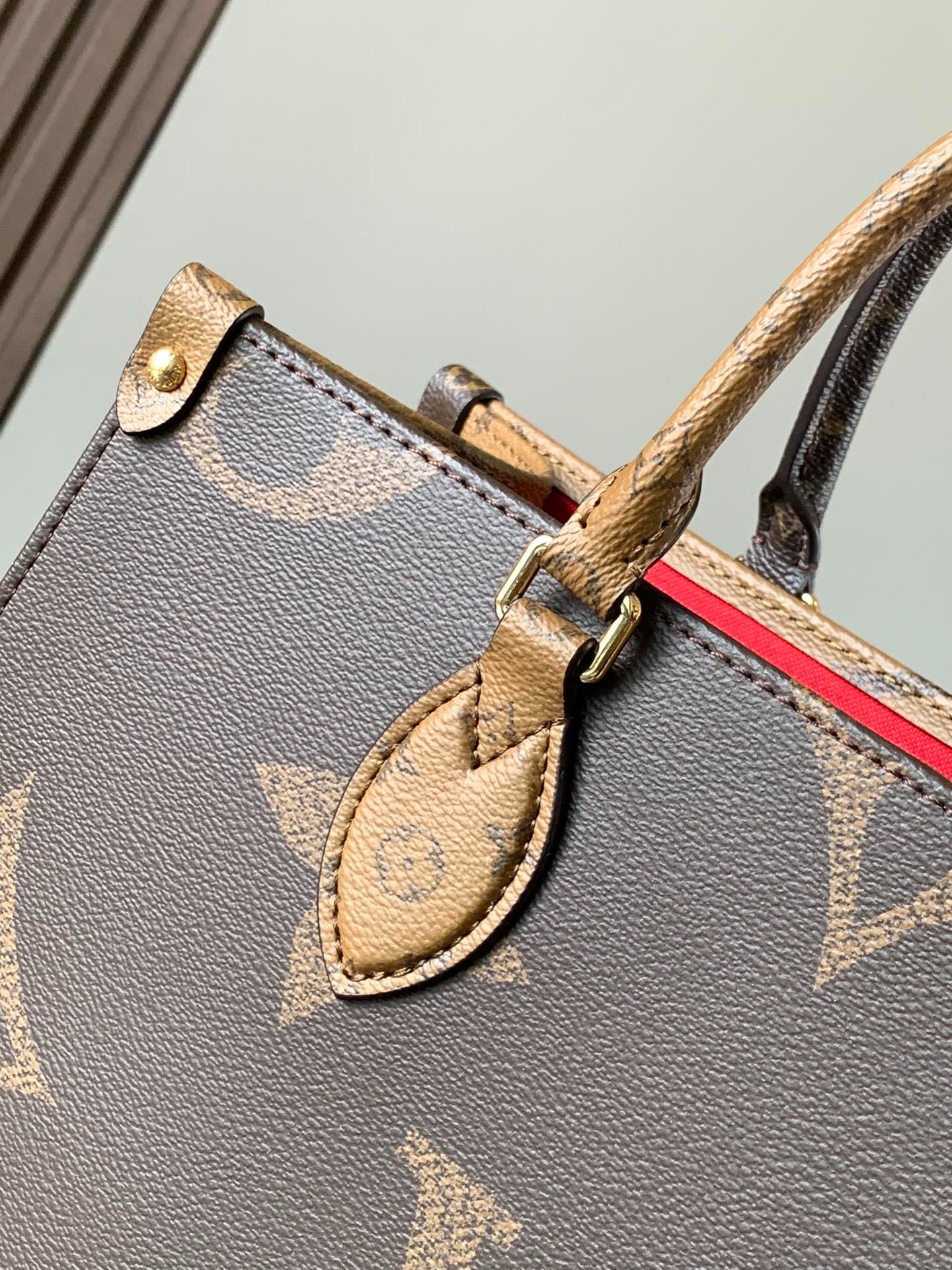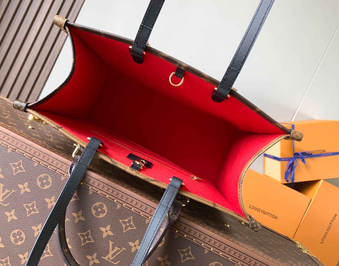 The M45321 Black Shoulder Strap Onthego Medium Handbag features classic Monogram canvas on one side and Monogram Reverse canvas on the other, offering a variety of stylish looks. The Toron handles and shoulder strap allow for multiple carrying options.