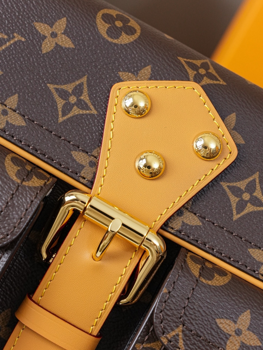 The monogram canvas, yellow leather, and studded front closure with two flap pockets are 30x19x10cm.