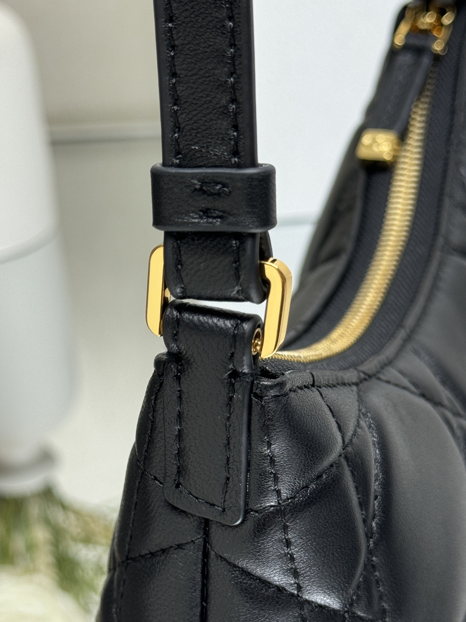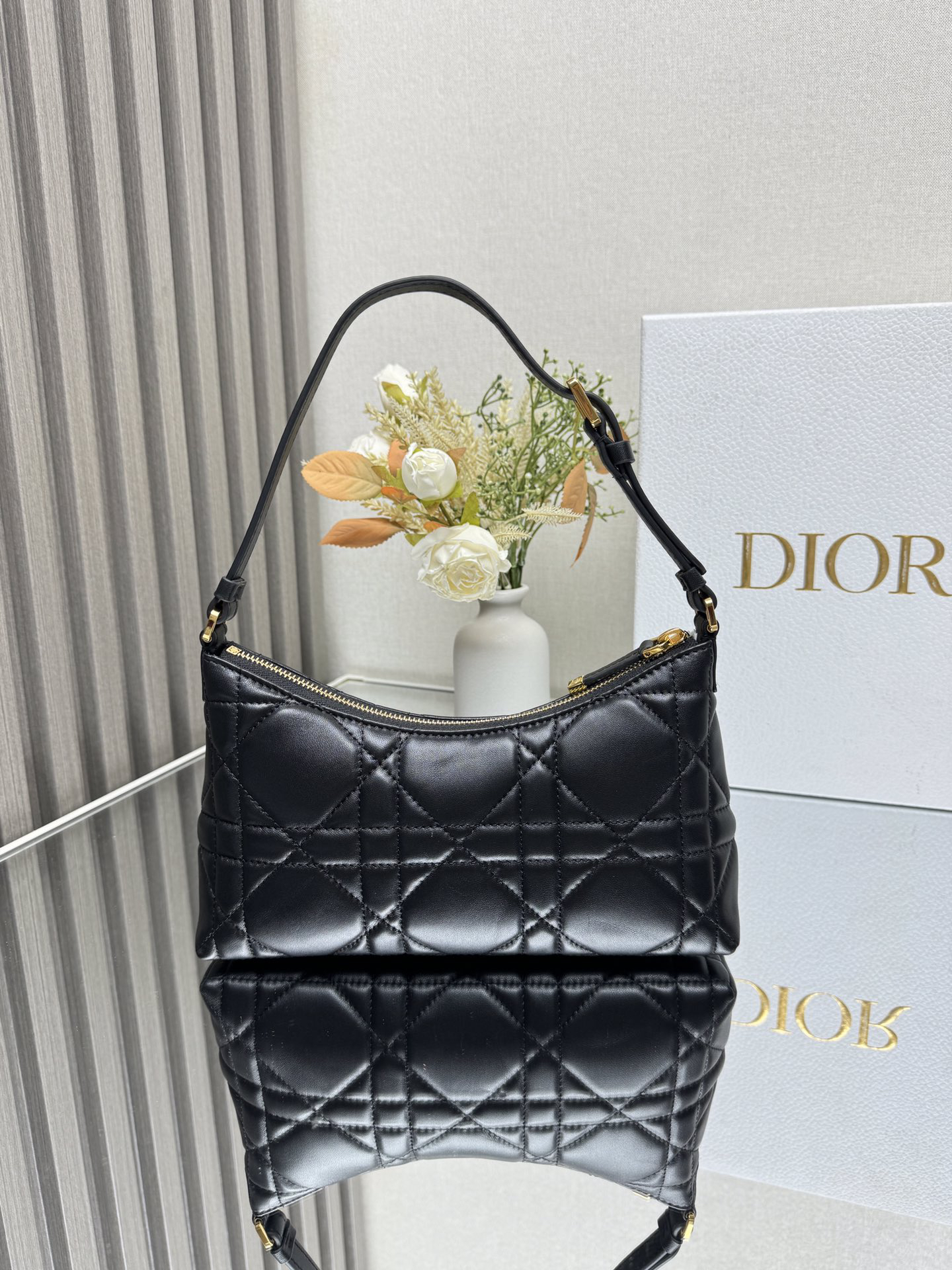 This mini shoulder dumpling bag is a new addition to the 2025 Pre-Spring collection, enriching the Miss Caro series with a stylish and refined piece. Crafted from black lambskin leather, it features oversized wicker-patterned satin stitching for elevated sophistication, accented with decorative tonal trim and a vintage gold-tone metal CD logo on the front. A zippered compartment holds daily essentials, while an adjustable leather shoulder strap allows for elegant crossbody wear.