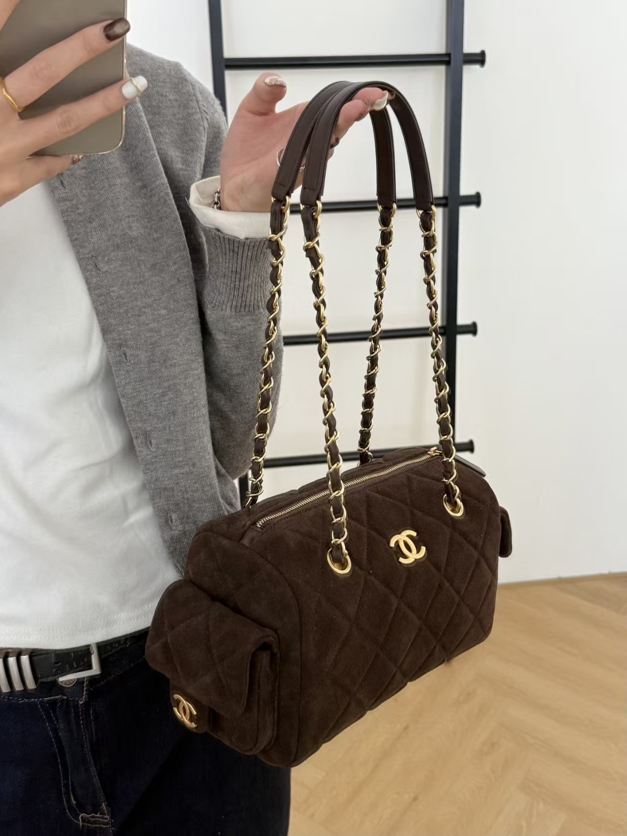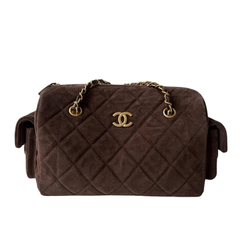 Chanel Small Bowling Bag Dark Brown Suede Antique Gold Hardware
