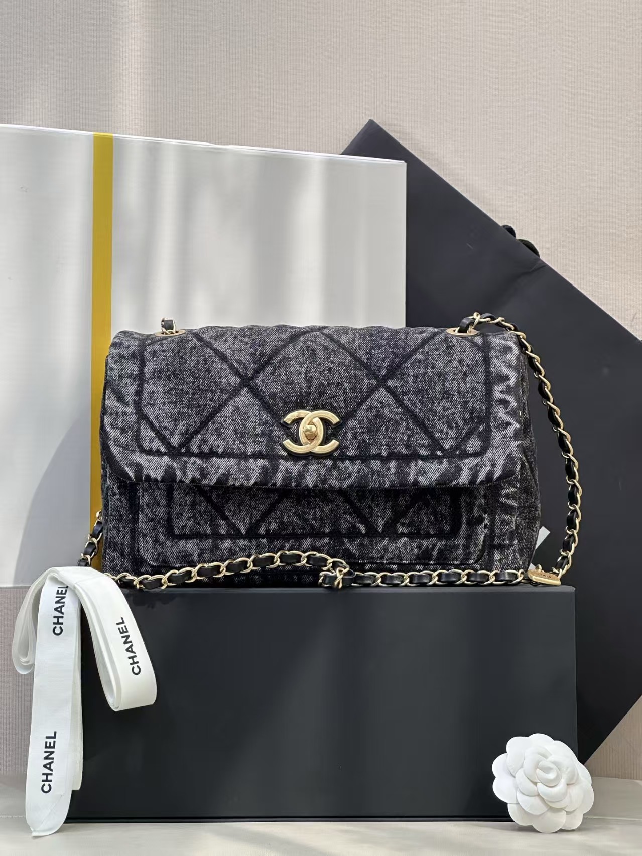Chanel 25k Black Dark Denim Flap Bag Aged Antique Gold hardware